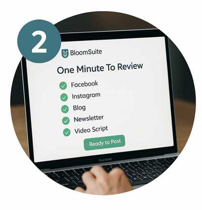 You can review and tweak your content from FB, Instagram, blog, newsletter and video script. Customize it as much as you want. When you're ready, approve it and post whenever you want.